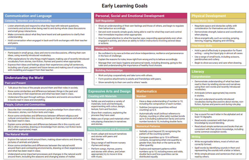 The EYFS profile summarises a child’s attainment against the early learning goals. There are seventeen early learning goals (sometimes shortened to ELGs) across all the Areas of Learning. The early learning goals are the goals or targets that children are working to achieve by the end of reception. The goals cover a range of skills that children will have been learning and practising throughout the Early Years Foundation Stage.